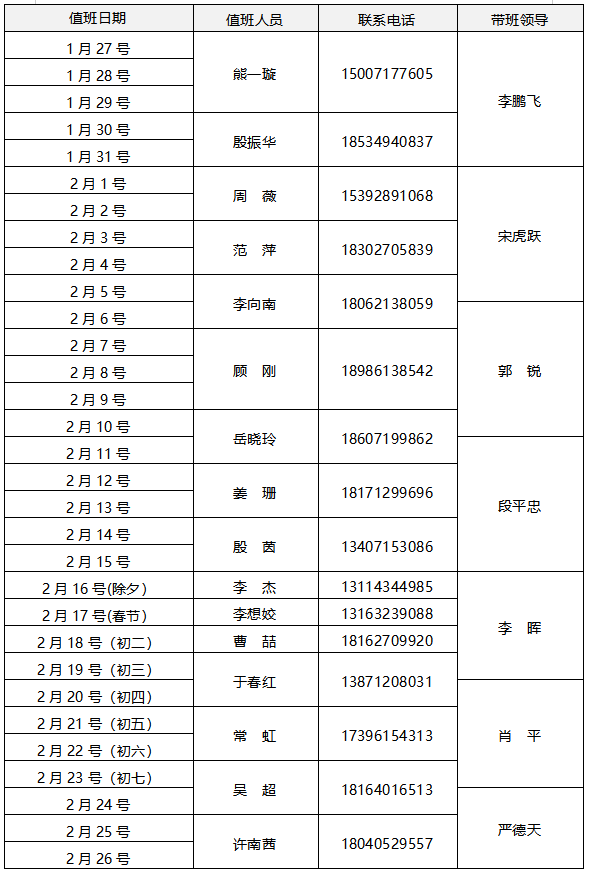 值班时间:2026年1月27日-2月26日